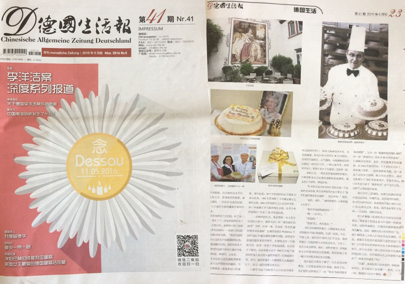 „ Viktoria-Café goes international“ Presseartikel in der „Chinesische Allgemeine Zeitung Deutschland“ (Ausgabe Mai 2016), anlässlich der neuen Kreation „Geburtstagstorte Elisabeth II“.