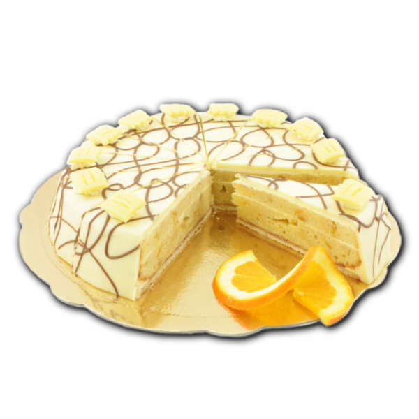 Der saftig-fruchtige Inhalt besteht aus erlesenen Zutaten. Mandeln, Butter und Orangensaft bilden die Grundlage für einen saftigen Boden der mit einer Orangen-Cointreau-Creme gefüllt ist. Überzogen wird die Spezialität mit weißer Schokoladen-Ganache und dekoriert mit kleinen Marzipankrönchen.