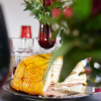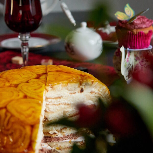 Auf feinem Schokoladen-Biskuit ruht eine erlesene Mischung aus frisch gepresstem Orangensaft, Sahne, Zitrone und badischem Wein. Das fruchtige Aroma dieser köstlichen Komposition wird umhüllt von saftig-zarten Biskuitrouladen-Scheiben und einem Fruchtgelee-Überzug.